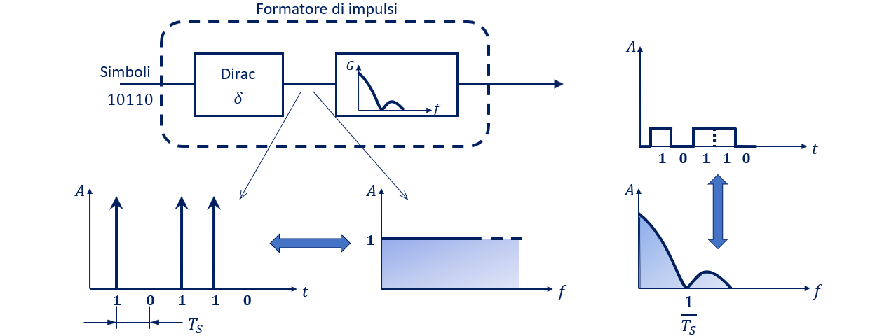 Il formatore di impulsi, in seno alla sorgente trasmittente, si può pensare come un dispositivo che associa ai simboli 1 e 0 (in caso di trasmissione binaria) degli impulsi di particolare forma; per semplificare la trattazione teorica, il formatore di impulsi è modellabile come un filtro particolare sollecitato con un treno di impulsi \delta di Dirac, distanziati di un tempo T_{S}, denominato periodo di simbolo, con il quale si può supporre di rappresentare i simboli dell’informazione (codice) da trasmettere.